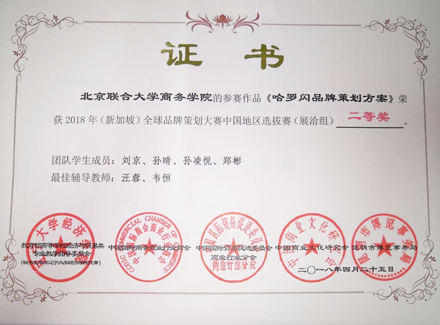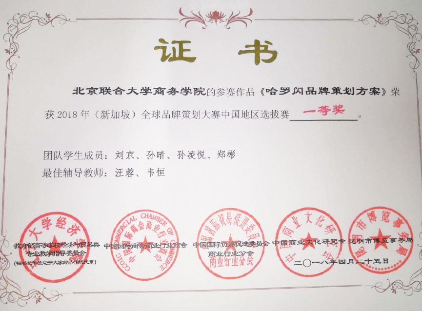4 月 25 日哈羅閃與北京聯(lián)合大學(xué)商務(wù)學(xué)院的參賽同學(xué)們?cè)趧?chuàng)意的海洋中角逐,一路過關(guān)斬將,在全球品牌策劃大賽中(中國(guó)賽區(qū))榮獲了三大獎(jiǎng)項(xiàng)。